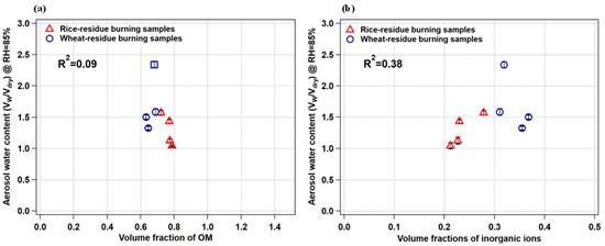 To further explore the role of organics and/or inorganics in water uptake by aerosol particles, we plotted aerosol water content (AWC) (Vw/Vdry) measured by HTDMA at 85% RH as a function of the volume fraction of organic matter and inorganic ions for rice- and wheat-residue burning samples, as shown in Figure 7a,b, respectively. A clear increasing trend and positive correlation (r2 = 0.38) between the datasets (Figure 7b) indicate a substantial contribution of inorganic ions to AWC. By contrast, no correlation (r2 = 0.09) was seen in the case of OM volume fraction (Figure 7a) suggests that the AWC is not highly sensitive to the abundance of OM in the studied particles. It is also important to consider the type and relative abundance of individual inorganic species in the particles to better understand the water-uptake tendency of the particles. As it can be seen in Figure 7a, the wheat-residue burning sample represented by an open square symbol (sample S2) has an almost comparable OM volume fraction with that of other wheat-residue burning aerosols; however, its AWC value is maximum. This can be explained by an almost 2-to-3-times higher relative abundance of nitrate ions in total WSI in sample S2 (i.e., 15%; 1.65 µg m−3) compared to samples S1, S4, and S5 (5 to 6%; 0.87 µg m−3, 0.25 µg m−3, 0.27 µg m−3, respectively) (Figure 2). In a study [51], it is suggested that nitrate particles internally mixed with organic species (oxalic and succinic acids) show continuous water uptake with increasing RH; therefore, the nitrate salts potentially have a significant impact on the hygroscopic nature and consequently the AWC of particles, particularly in urban regions, where nitrate concentrations are elevated. Nitrate salts like ammonium nitrate, particularly in submicron particles, have a tendency to absorb water steadily at low RH levels without obvious phase transitions [36]. Mixed aerosols containing nitrate salts and organic constituents demonstrate different phase characteristics and hygroscopic expansion depending on the specific components present in the particles. Results suggest that hygroscopicity is not broadly dependent on organic–inorganic composition, but that also the abundance of individual constituent species is important to consider. Therefore, the hygroscopic growth factors for the aerosol water extracts, together with the agreement/correlation observed between AWC and the ionic-species fraction, and individual ionic composition/abundance suggest that the water-soluble inorganic fraction of the crop-residue combustion particles potentially plays a significant role in governing the hygroscopic properties of the combustion-derived aerosols. Based on our results, the relative abundances among co-existing inorganic and organic species in the crop-residue combustion aerosol is the key driver of hygroscopicity. To establish a more general relationship between crop-residue burning samples and micro-physical hygroscopic properties, a more extensive study incorporating various agriculture waste-combustion-derived aerosols and integrating their chemical analyses may be important in the future.