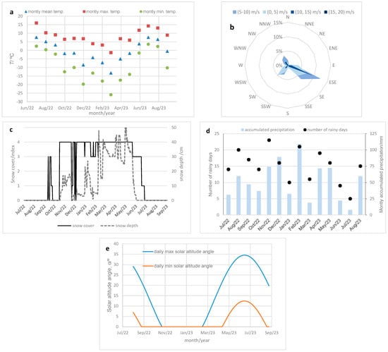 The comparison field is located in the Arctic research station, at NY-Ålesund, Norway (78°55′00″ N 11°56′00″ E). In general, Ny-Ålesund has a polar climate [13,14,15], despite winter temperatures being warmer than in other Arctic areas due to the North Atlantic drift. The monthly mean, maximum and minimum temperatures during the intercomparison period (16 July 2022 to 1 September 2023) are displayed in Figure 1a [15].