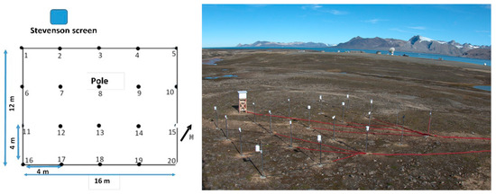 The comparisons site is in a flat terrain covered by homogenous natural ground with grass lower than 10 cm height along all the field intercomparison period. It is designed as a rectangular grid with 20 poles, each of them 4 m separated from the adjacent ones (Figure 2. The distance between the poles was decided as a compromise to make interactions between the screens insignificant while keeping all of them on a small area to guarantee the same meteorological conditions. Except for the Stevenson screen that is installed on a specific platform, each pole holds only one radiation shield, and all the shields and thermometers are set so that the temperature measurements are at 2 m height above the ground level during the summer when the ground is not covered by snow. This configuration, in combination with the fact that there are no major obstacles around the comparison field [18,19,20], guarantees that all the shields are freely exposed to temperature, solar radiation, wind and precipitation.