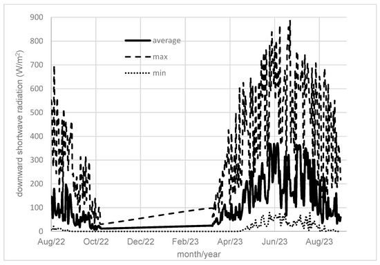 In this analysis, the establishment of the reference radiation shield is based on the measurements when direct sunlight reaches Ny-Ålesund, that is in the period between the 8 March and the 8 October, with the polar day between 18 April 2023 and 24 August 2023 [15]. Another factor considered by other authors [3,4,5,6,7,8] is performing the analysis under clear-sky conditions, but clear-sky events are rare at Ny-Ålesund [13,15]. For this reason, this work considers the measurements under all sky conditions, and the analysis is driven by the days with an average solar irradiance higher than a defined threshold values: the daily average of downward shortwave radiation higher than the corresponding values is included in Table 3. The values in Table 3 were defined by considering the climate information provided in [13]. Then, the establishment of the reference shield is based on the measurements of 114 days out of the 245 days with solar radiation reaching Ny-Ålesund. These 114 days were selected after analyzing the downward short-wave radiation (daily average, max and min) reaching the comparison field (Figure 3).