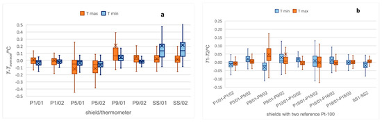 Readings of the thermometers in the potential reference shields for the daily maximum and daily minimum temperatures: (a) Differences to the average daily extreme temperatures. (b) Differences between the two Pt-100 included the shields for all the comparison period. “x” is the average value, “-” is the median, “□”is the 25–75% interval and “I” is the complete interval.