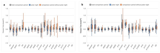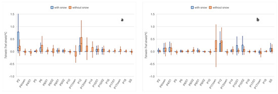The shields’ performance in relation to the snow conditions on the ground was also evaluated. For this purpose, the difference to the reference shield for daily extreme temperature values was analyzed in terms of the temporal period with the ground completely covered by the snow and the temporal period without snow on the ground. Figure 8 displays these differences. The establishment of the period of time covered by snow is based on the information provided in Figure 1c, considering only the days when the snow covering index takes the value of 3 or 4. The period of time without snow on the ground is defined by the days with a snow covering index of 0 and 1. Due to the solar irradiance being the main impact factor, the measurements taken in the period of polar nights were excluded from this study.