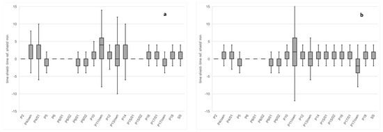 Response time of the different shields in relation to the reference shield for (a) daily maximum temperatures and for (b) daily minimum temperatures. “-” is the median, “□”is the 25–75% interval and “I” is the complete interval.