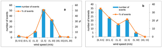 In this intercomparison, despite the voltage applied to the fan in the active ventilated shields being monitored along all the field campaign, there is not information about the real aspiration rate inside the shields nor was a complete previous characterization of the active shields performed in the laboratory. In addition, for many shield designs, natural ventilation is effective enough as soon as the wind speed is higher than 1 m/s [27,28,29,30]. Figure 4 shows the histogram of wind events (at 2 m) at the comparison field and for the days selected in terms of solar radiation limits (Table 3). Only 17.6% of the events had wind speed lower than 1 m/s, and as we see later in this work, these events happen mainly at night and in moments with low solar irradiance. This justifies the resolution of choosing a natural ventilated shield as the reference one.