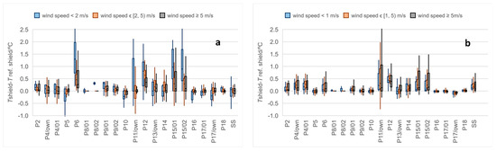 The shield at pole 12 is actively ventilated, and it includes two Pt-100, one of which is painted black. As shown in Figure 11g, this shield shows noisy measurements, even at polar nights with a lack of solar irradiance. For the period of polar nights, this shield is warmer than the reference one (natural ventilated), which is in agreement with the statement that the ventilated shields provide higher values of temperature at night [25]. On the contrary, this shield does not follow the rule that the active ventilated shield provides lower maximum temperature values [25] (event with solar radiation). The high difference in relation to the reference shield and the strong dependence of these differences with wind speed indicate this shield is affected by solar irradiance. On the contrary, Figure 11g shows similar measurements’ median values for the two Pt-100, independently of the thermometer emissivity. This is probably due to the combination of two facts: the residual solar radiation inside the shield is low and the active ventilation inside the shield reduces the possible effect of this (low) inner residual solar radiation.
