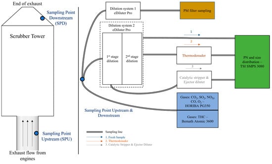 Samples were extracted from two different locations, upstream and downstream of the scrubber tower, which were designated as sampling point upstream (SPU) and downstream (SPD), respectively, as illustrated in Figure 1. The sampling method followed, the dilution systems and the instrumentation were the same for the two sampling points. The eDiluter was connected to the sampling probes by a transfer line, which was insulated and heated at 150 °C. This was primarily important for the SPD, to avoid condensation of the wet and cold exhaust on the probe but was also implemented for the SPU. These transfer lines were spanned for 2.5 m and 1 m at the SPU and SPD, respectively. The SPU transfer line was longer than the one on the SPD, due to lack of suitable space and ease of accessibility. The diluted sample was led through a 12 m insulated copper line to the instrument room, where the sample was split and fed to the individual instruments by Tygon tubing. The instrument room provided an ideal setting for instrument installation, since it was air-conditioned and equally spanned, between the SPU and the SPD.