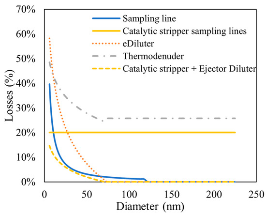 As seen from Figure 2, the losses were found to increase for smaller particles. Specifically, particle losses of up to 40% from the sampling lines were observed, which were mainly attributed to diffusion, and which decreased with increasing particle diameter. In the sampling line connecting the first stage of the eDiluter to the CS and the line connecting the CS to the ED, the losses were estimated to be constant at 20% for the whole size range. These losses were attributed to thermophoresis, since these lines were not insulated and were exposed to room temperature while hot exhaust was passing through. The losses associated with the eDiluter primarily resulted from the turbulent flow and the high residence time of the sample in the system []. TD losses, mainly attributed to diffusion in the adsorber section, were reduced with the increase in particle diameter and remained constant at 25%. Losses of up to 14% were found for smaller particles in the CS, due to diffusion and thermophoresis, and they were minimized with increasing particle diameter []. In general, particle penetration losses increased for smaller particles, due to diffusion and thermal losses [].