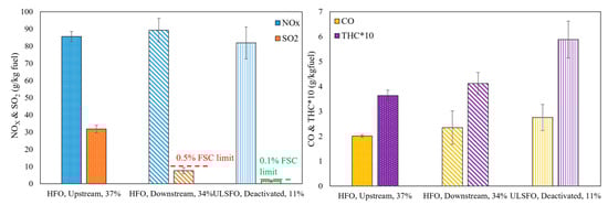 The high error bars depicted for the NOX, CO and THC for measurements conducted downstream of the scrubber were related to the high number of measurements performed over different operating conditions, compared to the upstream and ULSFO measurements, as detailed in Table 3. The scrubber operation may also have affected the measurement repeatability, considering that the properties of the incoming flow water may also have changed during the operation. Since these pollutants are combustion-related [,], operating conditions and, mainly, engine load variance are the critical parameters that affect their emission levels.