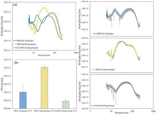 Mean PN size distribution (a) and PN emission levels (b) in (#/kg fuel) on “Fresh” sample, measured upstream and downstream of the scrubber with HFO and deactivated scrubber with ULSFO. Individual mean PN size distributions per each sampling point (right panels) are depicted along with error bars that correspond to standard deviation.
