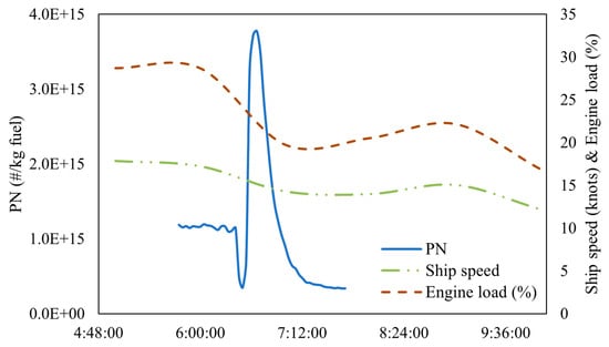 The transition from HFO2 to ULSFO took place as the ship approached the Turkish territorial waters, due to restrictions on the use of open-loop systems []. The PN concentrations were also measured during the fuel transition process and the mean PN emission level is presented in Table S2. The mean fuel transition PN emission level was of the same magnitude as most of the downstream scrubber PN levels and higher than the ULSFO one. In Figure 5, the PN emission levels at the fuel transition phase are presented over time for the ship’s trip, along with the ship speed (in knots) and the engine load (in %).