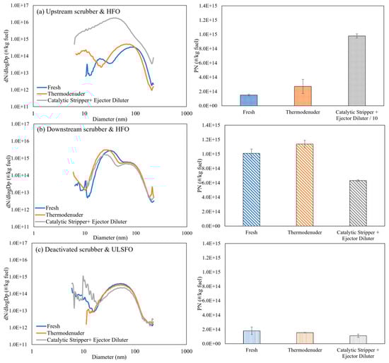 Mean PN size distributions (left panels) and mean PN emission levels (right panels) in (#/kg fuel) on “Fresh” sample, with “Thermodenuder” and with “Catalytic Stripper + Ejector Diluter”: (a) upstream scrubber with HFO, (b) downstream scrubber with HFO and (c) deactivated scrubber with ULSFO. The error bars correspond to standard deviation. PN upstream of the scrubber with “Catalytic stripper + Ejector diluter” is presented as PN/10.