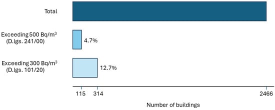 The data were evaluated considering the differences between the two regulations to highlight how the number of residential buildings of radiological interest increases with the new RLs. In fact, L.D. 241/2000 explicitly excluded residential buildings (art. 1, 1-bis) by providing underground workplaces and thermal spas with an action level (AL) of 500 Bq/m3 and managing it with an annual effective dose limit of 3 mSv.