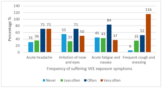 The majority of workers (71 (34%)) often experienced acute irritation of the nose and eyes, while fewer workers (33 (16%)) experienced irritation of the nose and eyes less often (Figure 1).