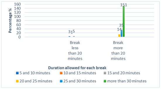 The majority of workers (n = 151, 72.2%) had breaks of more than 30 min, whereas fewer workers (1 (0.48%)) had breaks between 10 and 15 min, as described in Figure 2.