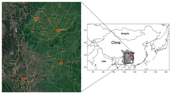 The sampling sites strategically selected for this study are located across four major urban centers in southwestern China, as indicated in Figure 1. Each site was selected to represent the unique environmental and urban characteristics of its respective city, facilitating a comprehensive analysis of regional air quality.