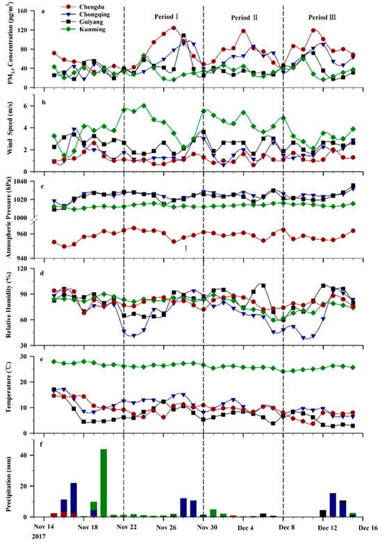 Additionally, Figure 2 presents the relationship between PM2.5 mass concentrations and meteorological parameters (RH, STP, TEMP, WS, and PRCP). Pollution episodes across all cities exhibited a periodic cycle of 7–8 days, as reflected in the fluctuations in PM2.5 concentrations. Typically, the PM2.5 concentration increased from less than 50 μg m−3 (clean) to 50–80 μg m−3 (transition) and exceeded 80 μg m−3 during heavily polluted episodes. Generally, PM2.5 levels are influenced by emissions, transportation, chemical transformations, and deposition processes, all closely linked to meteorological conditions []. Notably, higher PM2.5 concentrations were associated with lower wind speeds (WS), temperatures (TEMP), and precipitation (PRCP), which likely hindered the dispersion and removal of pollutants. For instance, Kunming experienced lower PM2.5 concentrations, benefiting from more favorable meteorological conditions, unlike Chengdu and Chongqing, where the opposite was true.