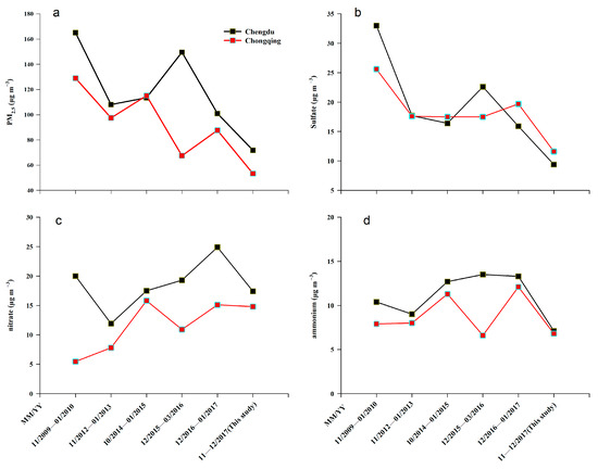 Annual variations in winter PM2.5 (a), SO42− (b), NO3− (c), and NH4⁺ (d) concentrations in Chengdu and Chongqing (2010–2017).