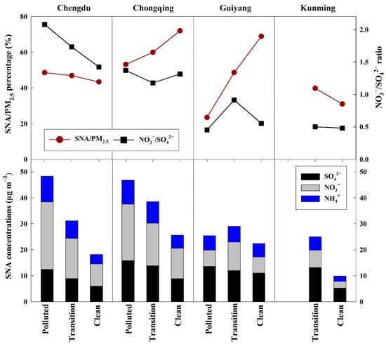 Variations in water-soluble ions ΣSNA (=SO4²⁻ + NO3⁻ + NH4⁺), NO3−/SO42⁻ ratios, and ΣSNA/PM2.5 mass percentages across different PM2.5 concentration intervals (Polluted, Transition, Clean) for each study site.