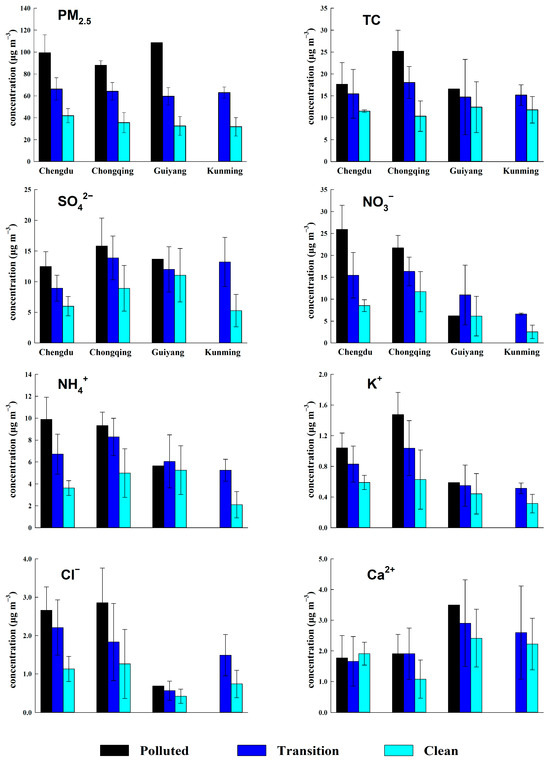 Individual water-soluble ion concentrations across different PM2.5 concentration intervals (Polluted, Transition, Clean).