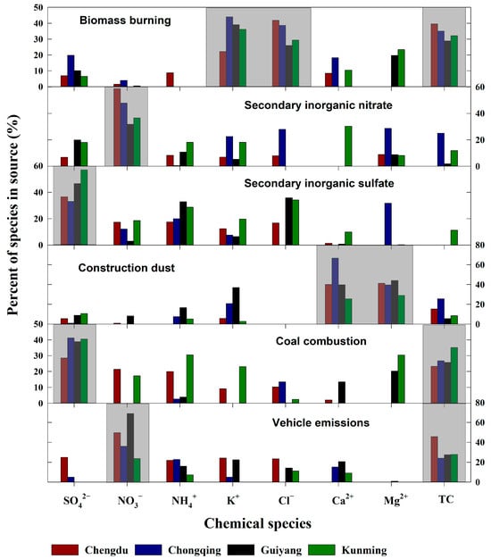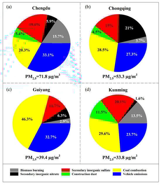 In summary, Chengdu and Chongqing exhibit a high influence of vehicle emissions and secondary inorganic aerosols on PM2.5 concentrations, indicative of the significant role of transportation and industrial activities in these urban areas. In Guiyang, coal combustion emerges as the predominant source of PM2.5, underscoring the city’s reliance on coal for energy and the associated air quality challenges. Kunming’s data reveal a more balanced distribution among sources, with coal combustion still leading but followed closely by vehicle emissions and secondary inorganic aerosols, suggesting a mix of industrial, vehicular, and natural sources contributing to the PM2.5 burden. These source profiles for the four urban sampling sites are consistent with the results of several earlier studies. For instance, compared to ten years ago, SO42− concentrations are reduced while NO3− levels are elevated, probably due to the greater vehicle-using population in the Sichuan Basin [].