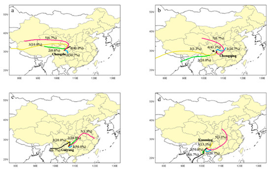 Backward trajectory clustering results for sampling periods. (a–d) represent Chengdu, Chongqing, Guiyang, and Kunming, respectively (different colors show the trajectories and the proportions of air masses expressed as percentages).