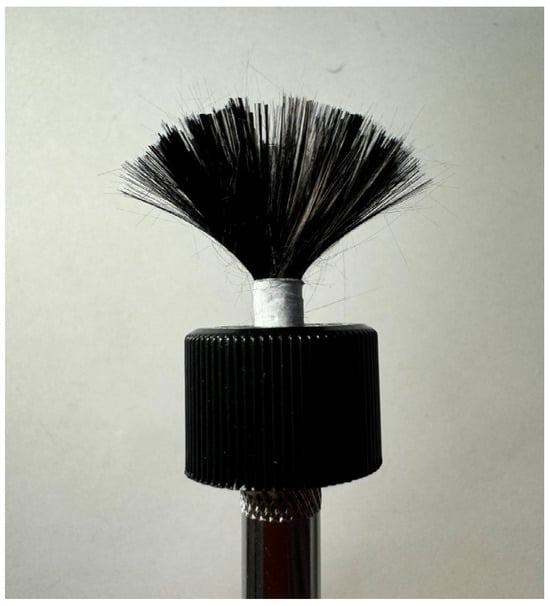 The carbon fiber negative oxygen ion generator manufactured in this study efficiently generates consistent negative oxygen ions by ionizing air through fine carbon fiber tips. Although carbon fibers are not as sharp as metal needles, their finer diameter and high curvature radius can produce a higher local electric field strength under the same voltage, leading to a more significant corona discharge phenomenon. As shown in Figure 1, the generator is designed with a large number of closely arranged carbon fiber bundles, which spread out at the ends to prevent mutual influence and shielding of the generated electric fields. Additionally, this study utilized a pre-treatment step where carbon source gas decomposes and deposits on the carbon fiber substrate surface, forming nano-carbon tips with high curvature radii. This pre-treatment significantly increases the electrode’s surface area and electric field strength, enhancing the electrode’s electron emission efficiency and boosting negative oxygen ion generation [24]. The formation of nano-carbon tips also helps to lower the operating voltage and avoid ozone production, thus improving air purification effectiveness and overall device performance [25].