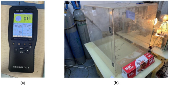 As shown in Figure 2a, this study utilized the commercial air detector Sensology MEF-550 to test these pollutants. The device measures formaldehyde using an electrochemical sensor, with a range of 0–2.5 mg/m3, a resolution of 0.01 mg/m3, a measurement error of less than ±1%, and a repeat accuracy of less than 2%. TVOCs were detected using a WINSEN semiconductor sensor, with a range of 0–9.999 mg/m3, a resolution of 0.01 mg/m3, and a measurement error of less than ±1%. Particulates such as PM2.5 were measured with a laser sensor, which has a range of 0–999 μg/m3 and a resolution of 0.1 μg/m3.