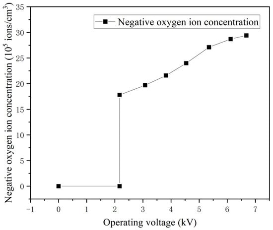 Among the many air purification technologies, the negative oxygen ion air purification method stands out due to its unique advantages. Generating large amounts of negative oxygen ions in indoor environments can efficiently purify the air and significantly reduce the concentration of suspended particles [14]. These negative oxygen ions effectively aggregate and settle dust and bacteria in the air, and they can also positively affect human health. Thus, the concentration of negative oxygen ions has become an important indicator for assessing environmental quality, sports facilities, and tourist attractions’ air quality [15,16]. However, traditional negative oxygen ion devices often generate ozone due to high operating voltages, negatively affecting the air environment [17].
