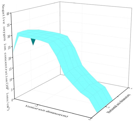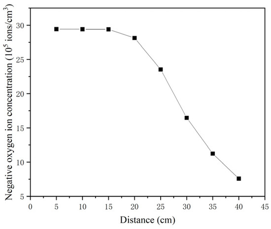 As shown in Figure 4, the concentration of negative oxygen ions significantly decreases with increasing distance from the generator. Within 5 to 15 cm of the generator, the concentration remains relatively high but begins to exhibit a nonlinear decay as the distance further increases. The experimental results indicate that the rate of decrease in negative oxygen ion concentration accelerates with increasing distance.