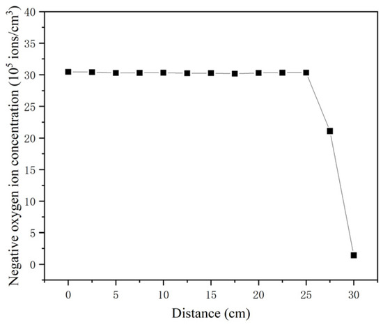 To determine the distribution characteristics of negative oxygen ions in a limited-length pipeline environment, the concentration distribution was tested in a 25 cm long pipeline. As shown in Figure 6, the concentration of negative oxygen ions remains at a high level throughout the 25 cm pipeline. However, it drops sharply at the open end of the pipeline.