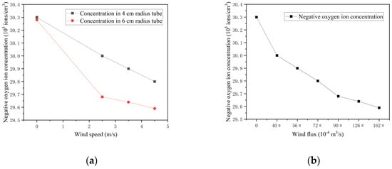 Air flow is one of the key factors determining the concentration of negative oxygen ions inside a pipeline. By changing the wind speed within the pipeline, i.e., the wind flux, the change in the concentration of negative oxygen ions can be observed. As shown in Figure 7a, this experiment used two different pipeline radii, 4 cm and 6 cm, with varying wind speeds to measure the impact of wind flux on negative oxygen ion concentration. According to the experimental data, the concentration of negative oxygen ions exhibits different trends as wind speed increases.