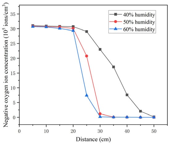 As shown in Figure 8, at the same distance, the concentration of negative oxygen ions decreases as air humidity increases. In an environment with 40% relative humidity, the concentration of negative oxygen ions can remain relatively constant at a high level during the initial stage (5 to 15 cm). However, in environments with 50% and 60% humidity, the concentration of negative oxygen ions at the same distance does not reach the same level. Particularly at 60% humidity, the concentration of negative oxygen ions shows a significant downward trend. This is because in a humid environment, the higher content of water molecules in the air makes negative oxygen ions more likely to form larger ion clusters by adsorbing water molecules and settling, leading to a decrease in negative oxygen ions.