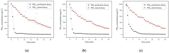 The cleaning effect of negative ions on particulate matter: (a) PM2.5; (b) PM1; (c) PM10.