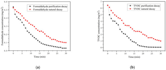 The cleaning effect of negative ions on (a) formaldehyde and (b) TVOCs.