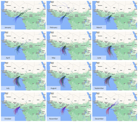 - Stein, A.F.; Draxler, R.R.; Rolph, G.D.; Stunder, B.J.B.; Cohen, M.D.; Ngan, F. NOAA’s HYSPLIT Atmospheric Transport and Dispersion Modeling System. Bull. Am. Meteorol. Soc. 2015, 96, 2059–2077. [Google Scholar] [CrossRef]