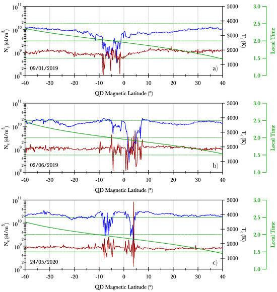 CSES-01 recorded electron density (, blue curve, left axis) and electron temperature (, red curve, right axis) during equatorial crossings on 09/01/2019, 02/06/2019, 25/05/2020, 25/06/2020, and 15/08/2020, arranged from top to bottom. The green curve represents local time (LT).