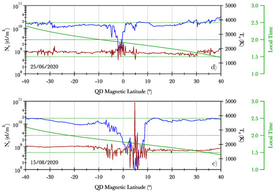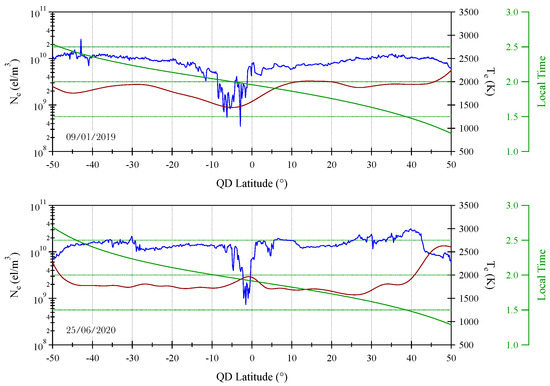 Figure 1 depicts an example of the data used. We looked at data from the satellite’s ascending orbit on 09/01/2019 between 13:24:07 UT and 14:01:32 UT, on 02/06/2019 between 10:29:06 UT and 11:06:22 UT, on 24/05/2020 between 11:23:47 UT and 12:01:14 UT, on 25/06/2020 between 10:47:22 UT and 11:24:44 UT and on 15/08/2020 between 02:34:09 UT and 03:11:32 UT. The green line represents the local time (LT), the red line the electron temperature (), and the blue line the electron density (). All of the quantities are reported using the quasi-dipole (QD) magnetic latitude. Despite the fact that our analysis focused on QD magnetic latitude between − and , Figure 1 depicts the trend of the quantities over a wider latitude range to provide an overview of the behavior of electron density and temperature along the satellite’s orbit. Equatorial electron density depletions can be seen approximately in the latitudinal range between − and , where electron density values drop sharply. Consistently with previous observations [45,46], equatorial electron density depletions are found in clusters, with one structure developing after another. What immediately stands out in these structures is the electron temperature trend. According to our selection procedure, the electron temperature is clearly far from being constant and is characterized by abrupt fluctuations that are undetectable outside of these irregularities. In all of the other chosen cases that are not displayed here, the temperature behaves in a similar manner. To evaluate the temperature within the identified plasma depletions and discern whether it generally registers as higher, lower, or similar to the ambient temperature in which these depletions develop and propagate, we utilized the empirical mode decomposition (EMD) method [47,48,49]. This enabled us to discern the large-scale trend of temperature, specifically within the plasma depletion. Indeed, the EMD method is a data analysis technique that is primarily used to decompose non-stationary and nonlinear time series data. Its effectiveness is particularly noticeable in the context of temperature data analysis. At its core, EMD is an adaptive, data-driven method that decomposes a signal into a finite set of intrinsic mode functions (IMFs) and a residual component called the residue. Each IMF represents a specific oscillatory mode within the signal, with varying temporal scales. IMFs are defined by two main criteria: they must have the same number of extrema and zero crossings, and at any point in the signal, the mean value of the envelope defined by the local maxima and the envelope defined by the local minima must be zero. The EMD process entails iteratively extracting IMFs from the original signal by following a sequence of steps: identifying all local maxima and minima, interpolating between them to generate a local mean (the envelope), computing the difference between the signal and its local mean to obtain the first IMF, and subsequently repeating this process on the residue (the original signal minus the first IMF) to extract subsequent IMFs. This iterative procedure continues until the residue becomes a monotonic function or meets a predetermined stopping criterion. The resulting IMFs capture the dominant oscillatory modes present in the signal across various temporal scales. Figure 2 presents an illustrative example of reconstructing the large-scale temperature trend using the EMD method. In detail, the figure displays temperature measurements recorded along the ascending orbit of the CSES satellite on 09/01/2019, and that on 25/06/2020. Overlaid onto this signal is the reconstructed temperature trend obtained by summing the IMFs characterized by the longest average scale (i.e., on the typical spatial scale of the plasma bubble) along with the residue. This reconstructed trend enables the determination of the average temperature within the depletions and facilitates comparison with the temperature outside the depletions. The majority of the studied depletions exhibit an average temperature lower than that of the background, while only a few cases show an average temperature higher or nearly equal to the background.