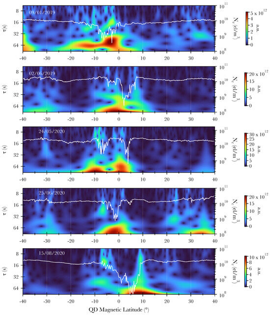 Continuous wavelet transform analysis applied to the electron density () recorded by CSES-01 during equatorial crossings on 09/01/2019, 02/06/2019, 25/05/2020, 25/06/2020, and 15/08/2020, arranged from top to bottom. The electron density trace is superimposed on each scalogram in white. The reported scalograms are inside the cone-of-influence (COI) being the shown interval shorter than the used data interval.
