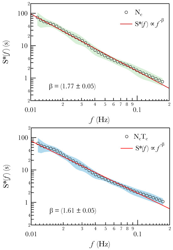 Top panel: Average normalized PSD () of electron density inside equatorial plasma depletions. The red solid line is a power law, ∼, with a power exponent . The green color band refers to standard deviation interval. Bottom panel: average normalized PSD () of electron pressure inside equatorial plasma depletions. The red solid line is a power law, ∼, with a power exponent . The blue color band refers to standard deviation interval.