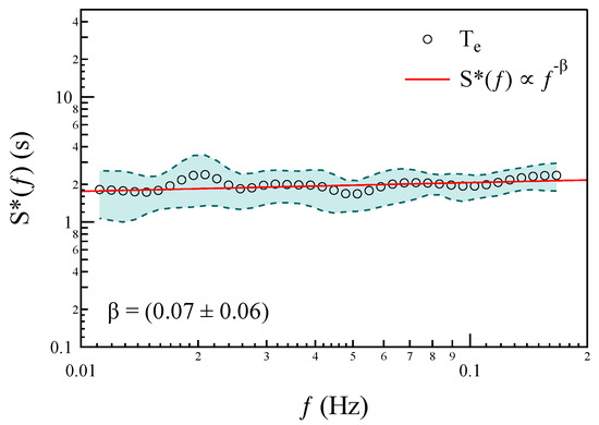 Average normalized PSD () of electron temperature, , inside equatorial plasma depletions. The red solid line is a power law, , with a power exponent . The light cyan band refers to a standard deviation interval.