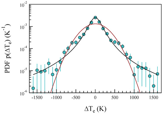 The probability density function of electronic temperature increments, . Solid line is an error-weighted fit using a Kappa distribution as reported in Equation (5). The red line is a Gaussian distribution having the same variance.
