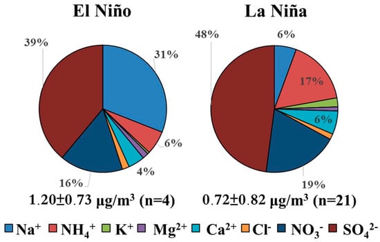 We collected the chemical compounds from the ambient air PM during the sampling period and divided them into those present in El Niño and La Niña. The concentrations and distributions of the WSIs were 1.20 ± 0.73 and 0.72 ± 0.82 μg/m3 during El Niño and La Niña (from 2018 to 2023), respectively (Figure 2). During the regular period, the average concentrations of TSP and PM2.5 ranged from 2.00 to 55.6 μg/m3 and 5.17 to 17.8 μg/m3, respectively. In addition, we investigated the distribution of atmospheric chemical components from 2006 to 2016 in Taiwan []. Thus, the average concentration of WSIs ranged from 0.22 ± 0.07 to 2.27 ± 1.87 μg/m3 from 2018 to 2023. Conversely, lower concentrations of particulate matter (8.14 ± 1.47 μg/m3) and PCDD/Fs (0.74 ± 0.26 fg I-TEQ/m3) were observed during El Niño. Additionally, a lower concentration of K+ (0.006 ± 0.003 μg/m3) in El Niño was observed in our study. This finding is consistent with the components of TSP, PCDD/Fs, and K+ originating from biomass burning [,,]. This indicated that the possible sources of the WSIs not only included biomass burning but also agricultural burning, coal combustion, and vehicle emissions as mixed pollution sources []. The components of WSIs were dominated by SO42− (39–61%), NO3− (9–25%), and NH4+ (6–22%). However, the concentration of non-sea-salt (nss) SO42− ranged from 0.13 to 0.95 μg/m3 during the observation period. As we know, aerosol chemical compounds can originate from emission sources and secondary aerosols [,,,]. There were no significant anthropogenic activities, such as stationary and mobile sources, at Mt. Lulin. Therefore, we collected the particulate chemical compounds to investigate the impact of long-range transport events. Table S2 illustrates the concentrations of WSIs during the observation years. A previous study revealed that the highest concentrations of nss SO42− (3.0 μg/m3) and NO3− (0.59 μg/m3) were transported through biomass burning events at Mt. Lulin from 2003 to 2018 []. However, the concentrations of nss SO42− (0.131–0.948 μg/m3) and NO3− (0.071–0.559 μg/m3) have decreased in recent years, as shown in our study. Moreover, the highest concentrations of nss SO42− (0.948 μg/m3) and NO3− (0.559 μg/m3) were observed in El Niño. This indicates that the intensity of the emission source has decreased in these years.