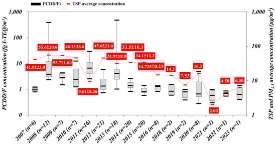 During the observation periods, the average atmospheric concentrations of PCDD/Fs and total suspended particles (TSPs) at Mt. Lulin station in the spring from 2007 to 2023 are depicted in Figure 3. According to our previous studies, the concentration of PCDD/Fs decreased from 2007 to 2015 (Table S3) []. Therefore, we continued to collect TSP and PCDD/F data over the following ten years. The TSP and PCDD/F concentrations ranged from 2.00 to 55.6 μg/m3 and 0.61 to 38.4 fg I-TEQ/m3, respectively, from 2007 to 2023. Particularly noteworthy were the higher concentrations of PCDD/Fs observed in 2008 (391 fg I-TEQ/m3) and 2013 (483 fg I-TEQ/m3). A biomass burning event was observed in 2008 and resulted in a high PCDD/F concentration []. The median concentration of PCDD/Fs during the sampling period at Mt. Lulin station was 1.37 fg I-TEQ/m3. Recent data indicate a decrease in the PCDD/F concentrations over the past eight years (average concentration of PCDD/Fs in 2015: 0.91 ± 0.25 fg I-TEQ/m3; average concentration of PCDD/Fs in 2023: 0.77 ± 0.44 fg I-TEQ/m3). Similarly, the average concentration of TSPs decreased from 55.6 ± 20.6 to 6.30 μg/m3 during the period from 2007 to 2023.
