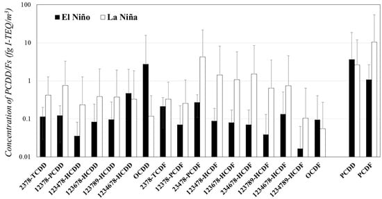 Generally, biomass burning occurs during the dry season each year in the tropical areas of Asia, including Thailand, Vietnam, and Indochina [,,]. This activity causes pollutants to rise to high altitudes in the atmosphere [,,,,]. Additionally, the El Niño phenomenon significantly affected the atmosphere in 2015 [,]. Previous studies have noted that forest fires, including biomass burning, open burning, and agriculture burning, become more frequent during extremely dry years [,,]. Between 1997 and 2004, the yearly PCDD/F emissions from open burning in mainland China were estimated to range from 1.38 to 1.52 g I-TEQ/year, accounting for about 10% to 20% of the total PCDD/F emissions in the region []. Recently, global-scale climate change phenomena such as El Niño (temperature increase) and La Niña (temperature decrease) are two different forms of the El Niño–Southern Oscillation (ENSO), distinguished by increased and decreased temperatures on the surface of the East Pacific Ocean [,,]. The La Niña phenomenon is characterized by a large amount of rain and increased humidity in the air [].