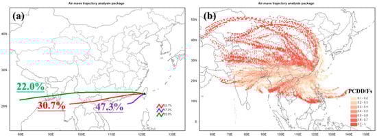 At Mt. Lulin, the sources of the Southeast Asia biomass burning episodes that occurred during spring were evaluated using backward trajectory analyses with HYSPLIT. Moreover, to identify the sources of atmospheric PCDD/Fs, PMF was employed to classify the emission sources and their contributions. According to the PMF user guide, using over 100 samples helps to control errors. Hence, this study used 150 samples collected between 2007 and 2023 to determine the possible pollution sources. The analysis using the PMF model identified three major sources of PCDD/Fs in the receptor region of Taiwan’s atmosphere: dust storm and monsoon events (19.3%), anthropogenic activities (28.5%), and biomass burning events (52.2%) (Figure S1). Factor 1 was dominated by 2,3,4,7,8-PeCDF (38.0%), 1,2,3,4,6,7,8-HpCDF (10.8%), and 2,3,7,8-TCDF (9.94%). Factor 2 was dominated by 1,2,3,7,8-PeCDD (21.3%), 2,3,7,8-TCDD (17.5%), 1,2,3,4,6,7,8-HpCDD (15.9%), and OCDD (12.1%). Factor 3 was dominated by 2,3,4,7,8-PeCDF (37.3%), 2,3,7,8-TCDF (12.4%), and 2,3,7,8-TCDD (10.1%). In addition, Figure 5 shows the results of the backward trajectory during the observation period. The trajectories indicate that 22.0% originated from India through southern China, 30.7% from Bengal through the Indo-China Peninsula, and 47.3% from the Pacific Ocean and Taiwan (Figure 5a). Based on the results of the PSCF, Figure 5b shows the maps of the potential PCDD/F emission source regions for the Mt. Lulin station during the biomass burning season from 2007 to 2023. The PSCF values are located at longitudes 50° to 145° and latitudes 10° to 60°. Obviously, the major potential contribution atmospheric PCDD/F source areas were located at the northern Asia continent, Southeast Asia, and coastal areas of the Philippines. Moreover, PSCF values with PCDD/F concentrations greater than 0.7 were observed in Mongolia, northern China and Southeast Asia (including southern Thailand, Cambodia, and southern Vietnam). This finding is consistent with the backward trajectory prediction.