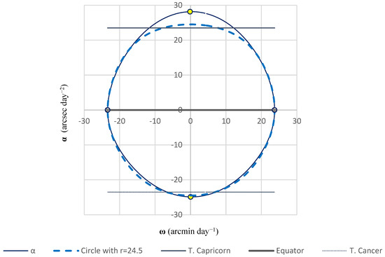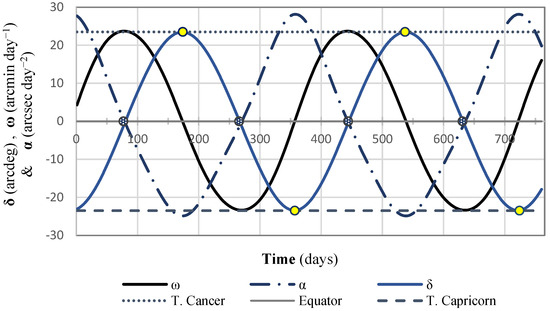 Before applying the factors 60 and 3600, both already included in Equations (3) and (4), the records of , and took place in the range of −23.5 to 23.5 arcdeg, −0.3896 to 0.3953 arcdeg day−1, and −0.0069 to 0.0078 arcdeg day−2, respectively. After applying the given factors, the records of the three parameters , , and fell in the range of 0 to 29; although the units were conveniently switched to arcdeg, arcmin day−1, and arcsec day−2, respectively.