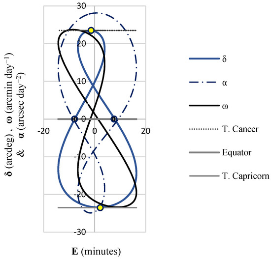The meridian declination (), angular velocity (), and acceleration () of the apparent Sun were plotted against the Equation of Time (E); where E is defined as the difference between the mean time and the solar time and comprises the abscise of the Sun meridional analemma.