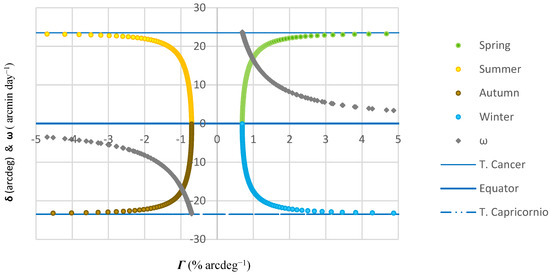 The association between and fits a circumference, where spring, summer, autumn, and winter lie in the quadrants I, II, III, and IV of the circle , respectively. When signs are disregarded, varies in direct proportion to . Every range of latitude conforms to characteristic records of , , and . For example, the four instances of belt C showed comparable records of and , with only slight differences between hemispheres. Disregarding the signs, the dynamics of declination was equivalent between seasons whose resultant drive coincide (spring vs autumn; summer vs winter), whereas the three parameters , , and varied in reverse order between seasons whose resultant drive differed (spring vs. summer; autumn vs. winter).