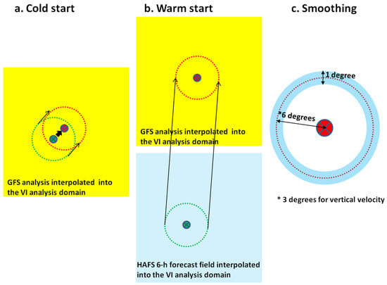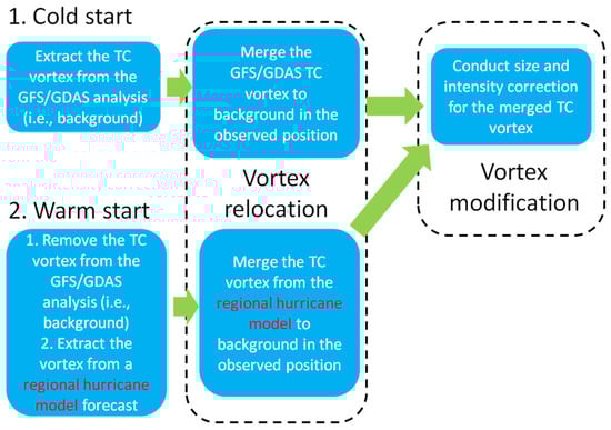 The NCEP has been using very sophisticated VI methods for its operational hurricane model, including a Hurricane Weather Research and Forecasting (HWRF) model, Hurricanes in a Multi-scale Ocean coupled Non-hydrostatic (HMON) model [13], and Hurricane Analysis and Forecast System (HAFS) based on [14]. Although NCEP’s VI method was originally developed for HWRF, it has also been used for HMON and HAFS because of its excellent capabilities. The basic concept of this VI method combines the dynamically initialized vortex method and bogussing algorithm (schematic diagram in Figure 1).