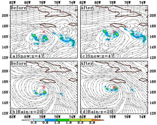 (a) Snow mixing ratio (g kg−1) and streamline of GFS analysis (for the cycle of tropical depression 26L at 0600 UTC on 5 October 2020), which is interpolated into the 47th level of VI analysis domain (before the relocation procedure). The red X mark denotes the observed TC position. (b) As in (a) except for rain water mixing ratio (g kg−1) and streamline of GFS analysis, which is interpolated into the 20th level of VI analysis domain. (c) As in (a) except for the VI analysis after the relocation procedure. (d) As in (b) except for the VI analysis after the relocation procedure.